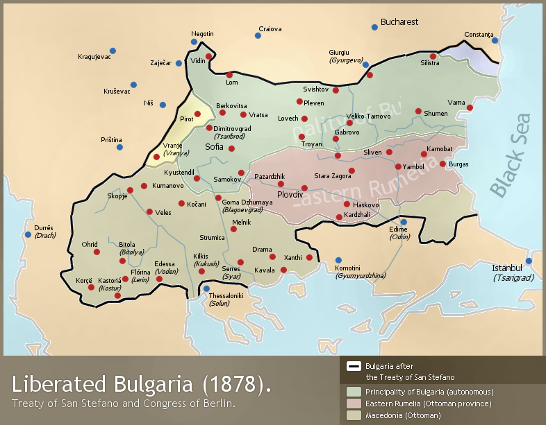 A map of Bulgaria (1878) - borders after the Treaty of San Stefano (3 March 1878) and the Congress of Berlin (June 1878).