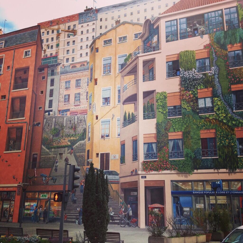 Après trois mois de travaux, le célèbre Mur des Canuts, créé en 1987, refait en 1997, percé d'une traboule en 2002, dévoile au public sa troisième version (inaugurée le 17 avril à 19 heures). Cette fresque en trompe-l’œil, une des plus importantes d'Europe par sa taille (1200 m2), est aussi exceptionnelle par son histoire (c'est le premier mur peint lyonnais par la Cité de la Création), et par son succès (c'est le lieu touristique le plus visité de la Croix-Rousse selon l'Office du Tourisme). La fierté de la Croix-Rousse. Ce statut confère une responsabilité particulière aux concepteurs du projet. Loin de nous de dénigrer une réalisation à laquelle de nombreux habitants du quartier adhèrent et qui suscite souvent une certaine fierté. Qu'il nous soit cependant permis, puisque cette œuvre murale nous est présentée comme évolutive, d'avancer quelques suggestions qui pourraient être prises en compte pour la quatrième version ... Amis lecteurs, n'hésitez pas à apporter votre petite touche personnelle à cette fresque en réagissant à cet article; nous transmettrons vos avis aux concepteurs et donneurs d'ordres concernés. Canut où es-tu? Nos réserves, qui se veulent constructives, tiennent d'abord à l'emprise grandissante de la publicité sur cette fresque. Bien sûr, un tel projet a besoin de sponsors; ils sont assez nombreux et chacun revendique une place en fonction de sa contribution, mais trois d'entre eux se positionnent de façon réellement dominante, au risque de troubler la lecture de la fresque et d'en fausser le message. Ainsi la Banque Populaire Rhône et Loire, qui occupait déjà un très large espace, voit son enseigne agrandie et courir en grosses lettres sur la totalité de la façade de l'agence. Le véhicule Renault, précédemment placé tout en bas, prend de la hauteur en devenant une voiture électrique défendant les valeurs écologiques d’ E.D.F. L'attention du spectateur est d'emblée captée par cette publicité occupant le centre de l’œuvre. Et que dire de l' O.P.A.C. (Office public d'aménagement et de construction, NDLR-lol) qui a chassé la boutique des rouleaux de tissu pour proposer ses appartements dans le Vieux Lyon ou à la Confluence ? En conséquence, les emplacements réservés à l'évocation directe des canuts tisseurs de soie sont limités à deux éléments: l'atelier de tissage "Rêves de soie" (qui a perdu son extension) et, plus haut, un immeuble reprenant succinctement certains décors des "Routes de la soie" vus dans le quartier Clos-Jouve. On peut rêver ... C'est déjà ça direz-vous ... Rappelons que la première version de la fresque en 1987, à la gloire de Guignol, n'évoquait pas le travail des canuts ! Ne pourrait-on pas cependant faire émerger de nouveaux rêves de soie sur ce mur ? Dans la traboule peut-être qui a perdu son défilé de costumes et qui est nue actuellement? Cette troisième version a voulu mettre en lumière l'aspect développement durable en "végétalisant" la partie droite de la fresque. Les plantes et les fleurs en trompe-l’œil sont-elles un palliatif à la minéralisation grandissante du quartier? Le trompe-l’œil jouerait-il alors un rôle de leurre pour le citadin en quête de verdure? D'autres choix auraient peut-être été plus judicieux: les feuilles de mûrier sont très belles aussi et elles auraient pu commencer une histoire ... "Ces murs, c'est la peau des habitants" proclame un concepteur du projet. Il est en effet émouvant d'y retrouver des gens du quartier et de les voir changer d'une version à l'autre. Ainsi, la petite fille dans les bras de son père en 1997, est maintenant une étudiante accompagnée d'un jeune frère d'une douzaine d'années qui n'était pas né dans la version précédente. Le père lui, adolescent en 1987, est toujours là, à Vélo'v dorénavant ... On découvre également avec intérêt de nouvelles figures comme le chanteur des rues Jean-Marc Le Bihan ... On peut regretter cependant une prise en compte "à minima" de l'histoire des tisseurs de soie. Il ne faudrait pas qu'à terme le mot canut soit vidé de sa substance pour devenir un simple stimuli commercial et touristique. L.B. ajout de JPR : voir aussi le site officiel des murs peints de Lyon : http://www.lyon.fr/page/culture-et-loisirs/balades-en-ville/les-murs-peints.html |